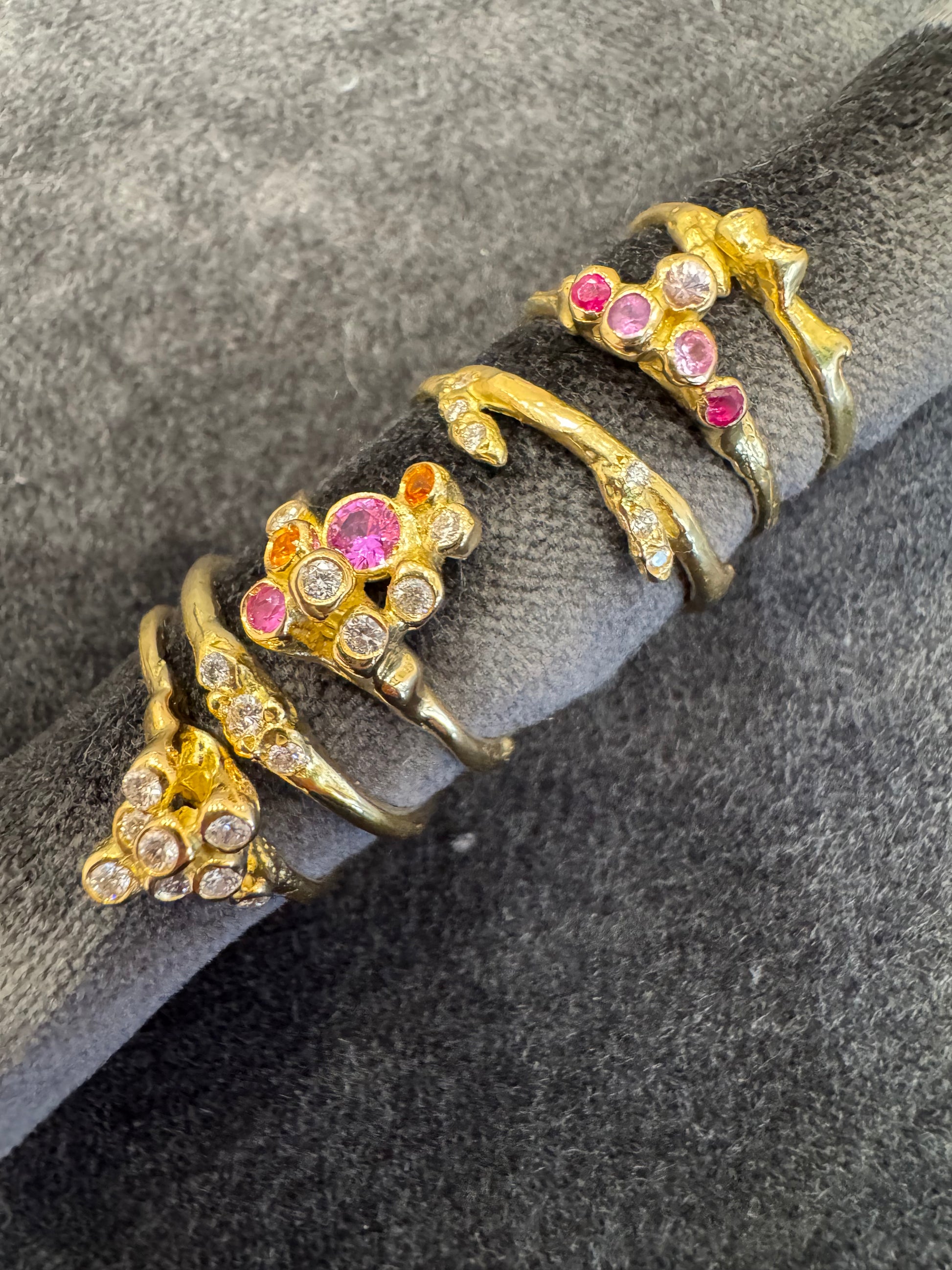 Inspired by the beauty of sea anemones, this ring features a blend of organic design and precious gemstones. The warm orange and pink sapphires contrast with sparkling diamonds in an organic nature-inspired setting.