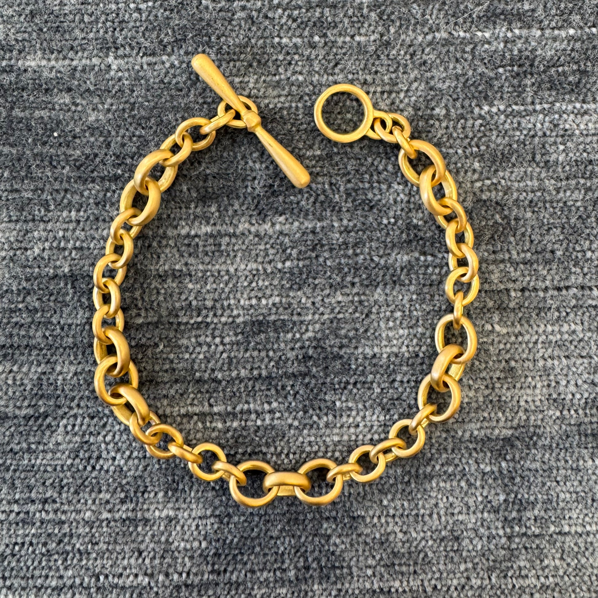 Handcrafted 18k gold link bracelet made in NYC. Bold, architectural design with secure toggle clasp. Satin finish.