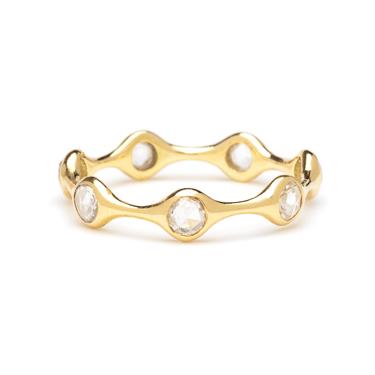 This sweet eternity band features 7 rose cut diamonds set in a carved gold band. The rose cut diamonds lend a vintage, old world feel, while the sculptural setting sets a modern tone.