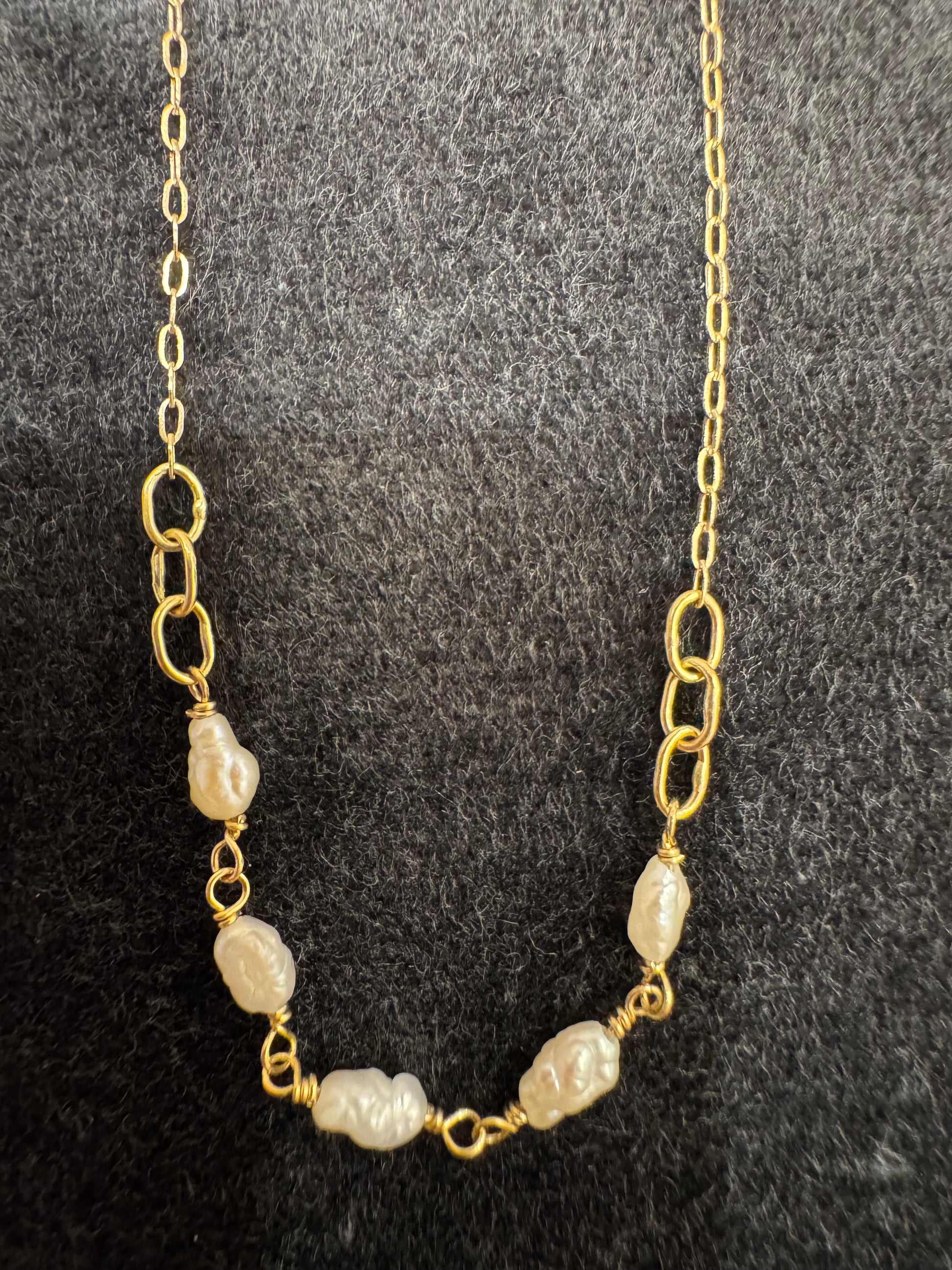 A dainty segment of handmade 18k gold links and keshi pearls, on 14k gold chain. Total length 17" length with handmade clasp.