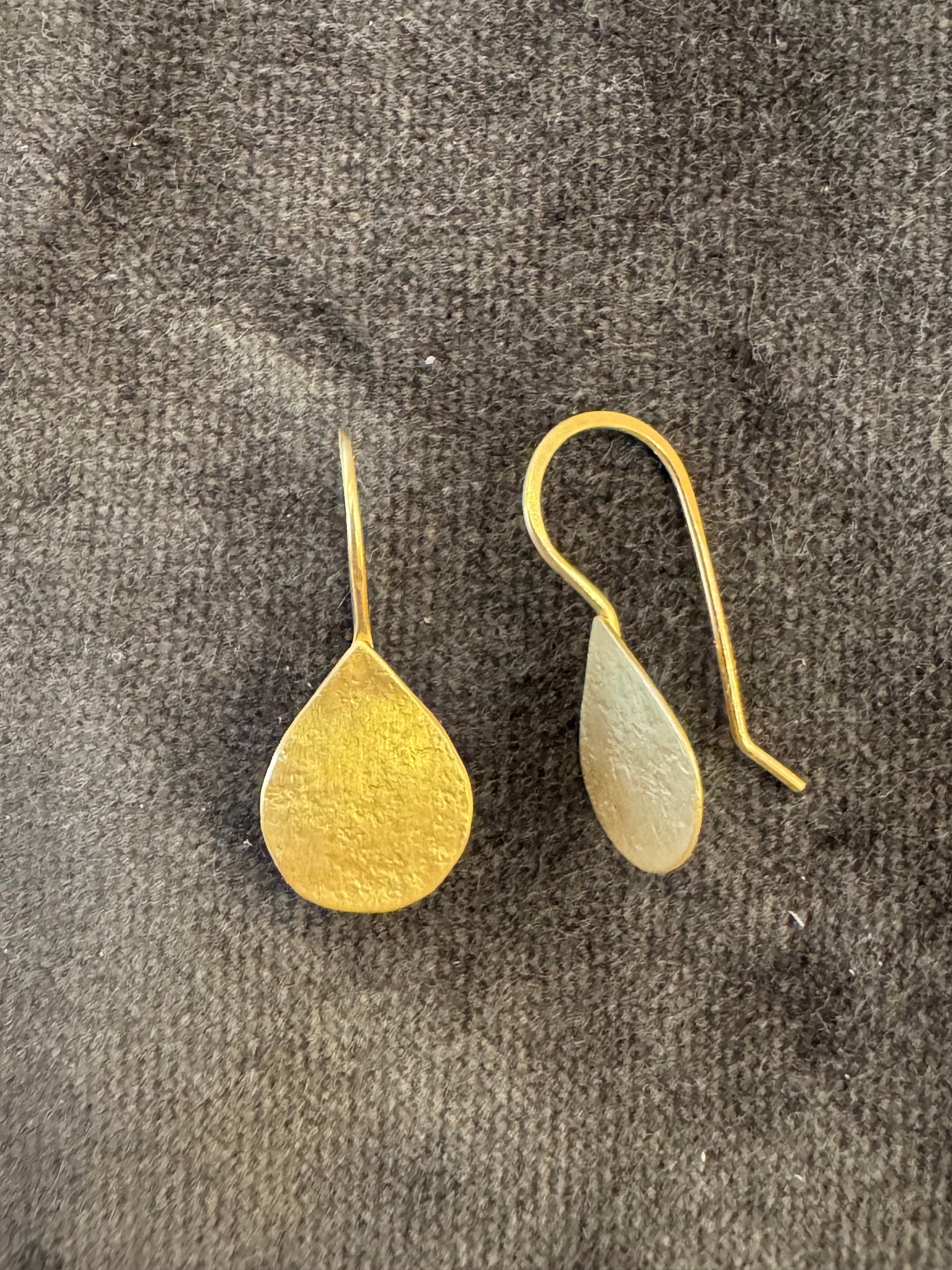 Gold teardrops (10mm length) are textured using an antique hammer, to create a parchment-like effect. Handmade in 18k gold with stationary ear wires.
