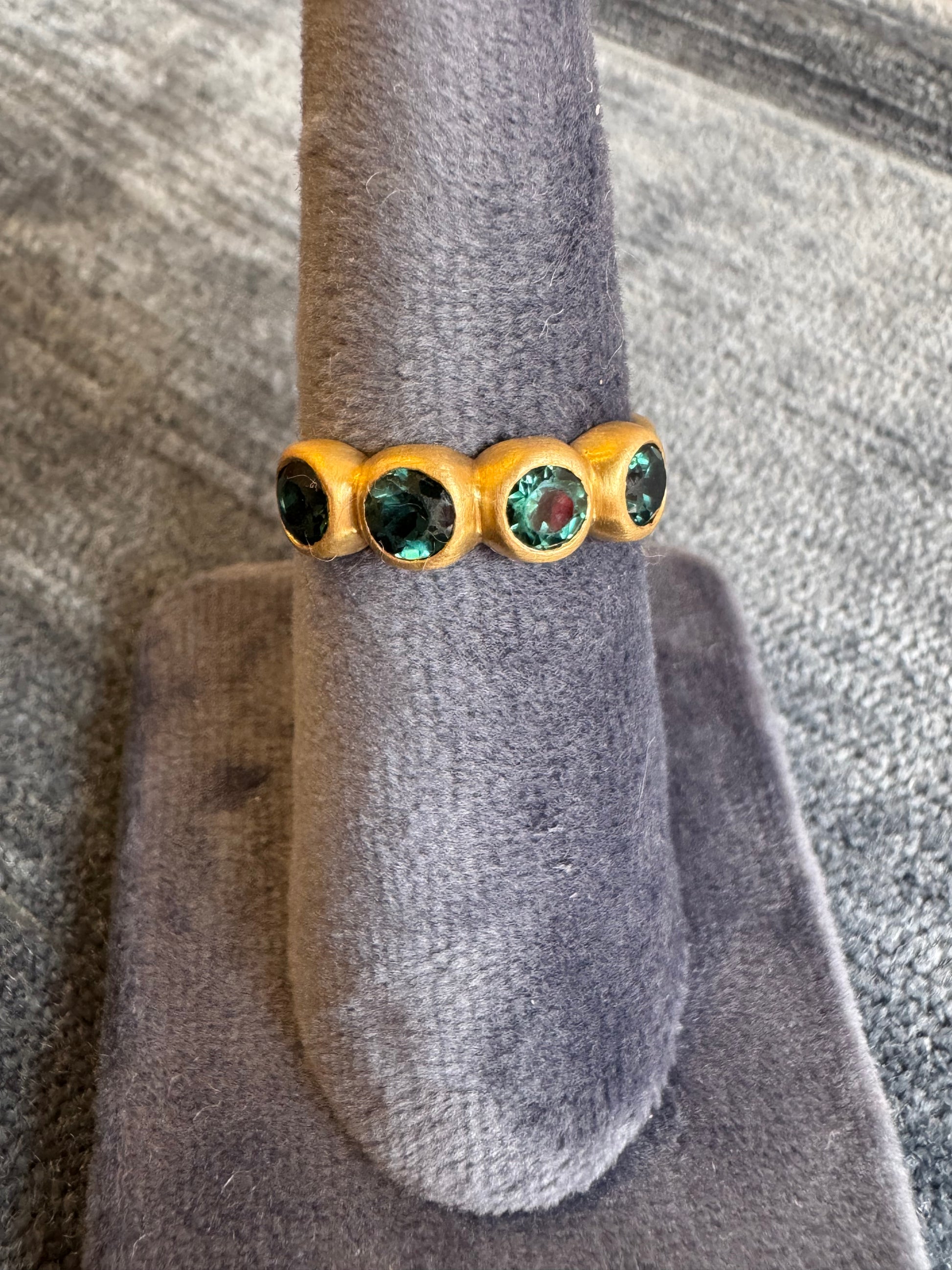 This stunning band showcases four exquisite 4mm blue-green tourmalines set in artisanal 18k gold.