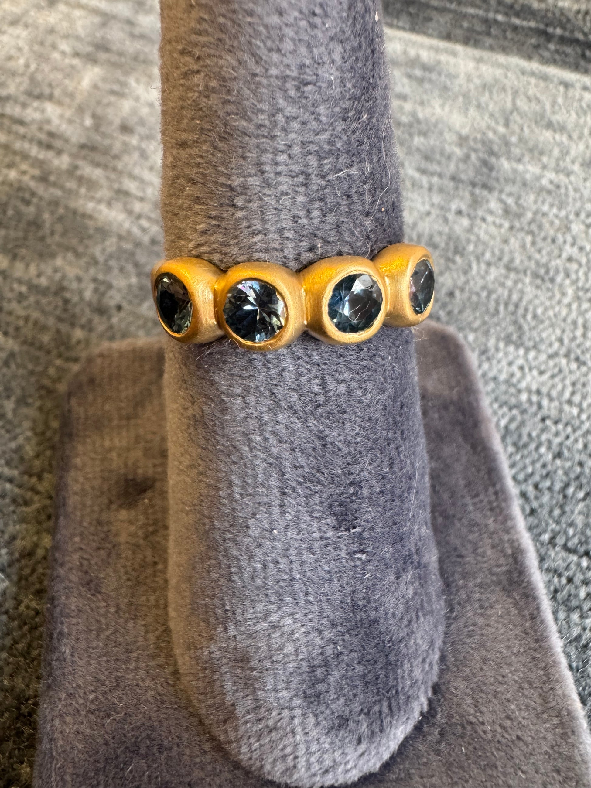 This handcrafted band features four stunning 4mm medium blue Montana sapphires set in luxurious 18k gold.