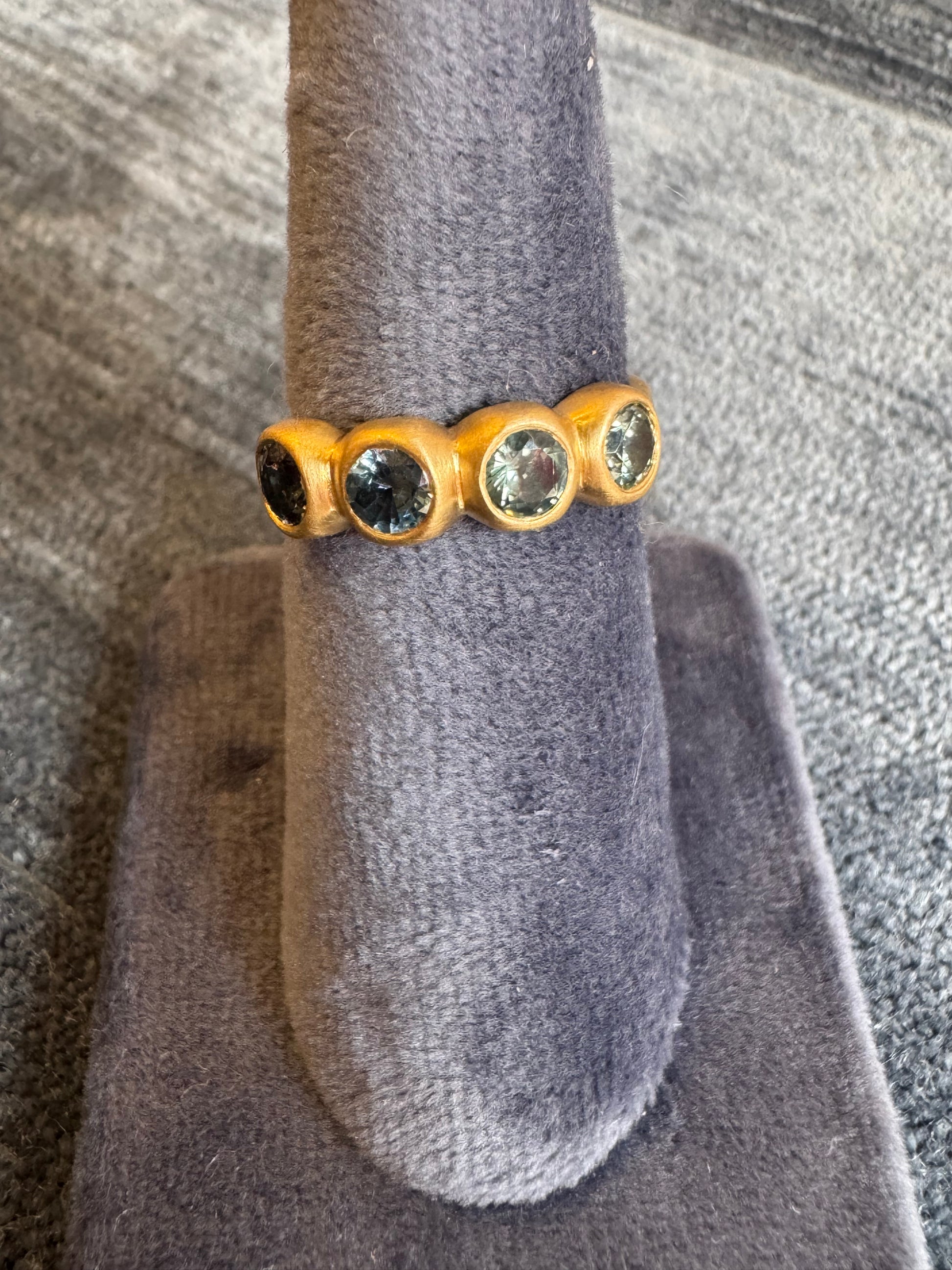 This stunning band showcases four exquisite 4mm blue-green ombre Madagascar sapphires set in artisanal 18k gold.