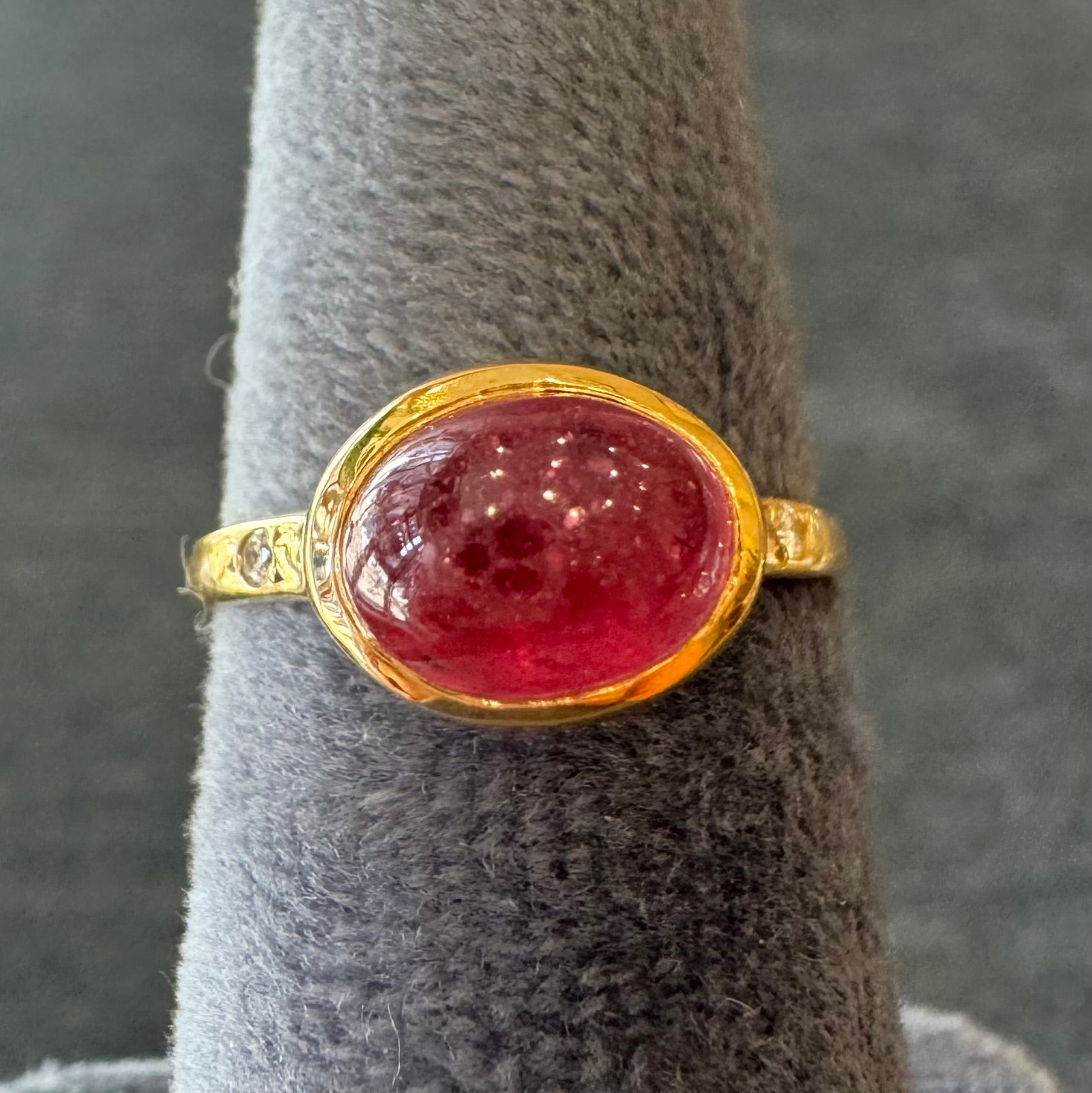 A vibrant ruby cabochon takes center stage in this 18k handmade ring, while sparkling diamond accents add a touch of timeless sophistication.